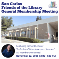 This year’s annual SCFOL General Membership meeting will be held Wednesday, November 12, 2025 from 3:00-4:30 pm, in the San Carlos Branch Library’s Winer Family Community Room & Art Gallery. All SCFOL members are invited to attend.